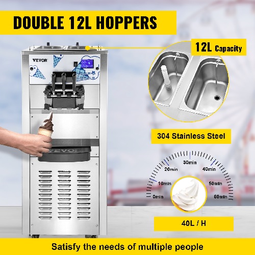 Công suất sản xuất cao 12L: Máy làm kem này được thiết kế với hai phễu 12L, cả hai đều được làm bằng thép không gỉ 304 phù hợp với thực phẩm và có thể sản xuất tới 40 lít kem mỗi giờ, có thể đáp ứng nhu cầu hàng ngày của hộ gia đình hoặc thương mại.