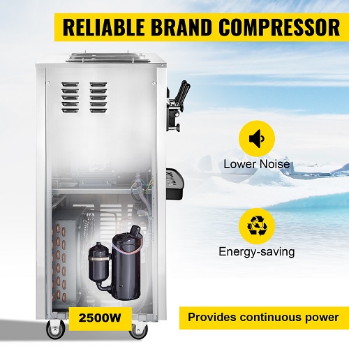 Máy nén thương hiệu 2500W và chất làm lạnh mang lại hiệu quả cao hơn và tiêu thụ điện năng thấp hơn. Khi phát hiện thiếu nguyên liệu, máy sẽ nhắc bạn bổ sung hỗn hợp. Chức năng làm mát sơ bộ và lớp tạo bọt tích hợp giữ cho hỗn hợp tươi lâu hơn.